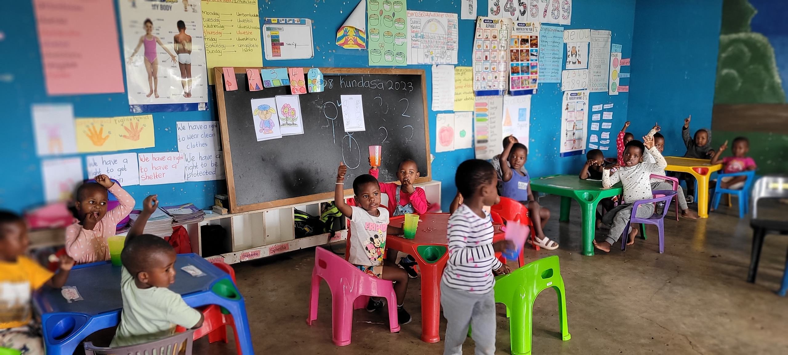 Up until now they have had to sit on oil cans (!) or use the child size chairs and desks.